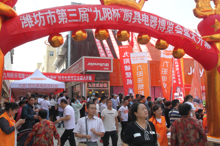 5月19日,民生西街豐華大廈廣場和豐華步行街上,“九陽杯”濰坊第三屆廚具電器博覽會開幕暨全國首家九陽品牌旗艦店開業隆重舉行。